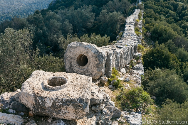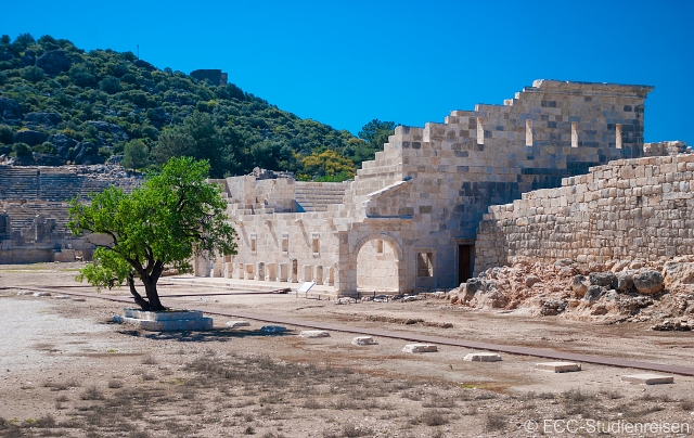 Bord genießen wir ein BBQ-Mittagessen. Weiter geht es mit dem Boot zu dem unterhalb einer Burg gelegenen Dorf Simena, das wahrscheinlich zu den schönsten Orten am Mittelmeer gehört. Das winzige Dorf, das nur zu Fuß oder mit dem Boot erreichbar ist, hat einen Hafen mit antiken Sarkophagen, römischen Bädern und Häusern, die sich an den Hang unterhalb einer mittelalterlichen Burg schmiegen. Wenn wir zur Burg hinaufwandern, finden wir in ihren Mauern ein winziges antikes Theater – das kleinste in Lykien, mit einer Sitzkapazität von etwa 300 Personen. Das aus dem Felsen gehauene Theater ist ein wunderbarer Ort, um die schöne Umgebung auf sich wirken zu lassen. Hier endet unsere erste Wanderung auf dem Lykischen Weg!