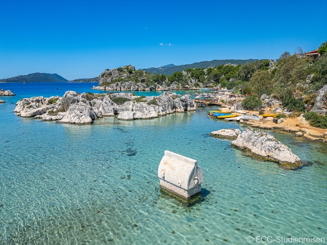 Heute wandern wir zum Weiler und antiken Hafen von Aperlae und fahren von dort mit dem Boot zur Insel Kekova mit seiner versunkenen Stadt. Mehrere Erdbeben sind dafür verantwortlich, dass Straßen und Gebäude im Meer versunken sind – ihre Reste sind im kristallklaren Wasser gut sichtbar, es sind Mosaikpflaster, Terrakotta-Amphoren, Mauern und Treppen zu sehen, die einst Teil dieser abgelegenen Inselgemeinde waren. An